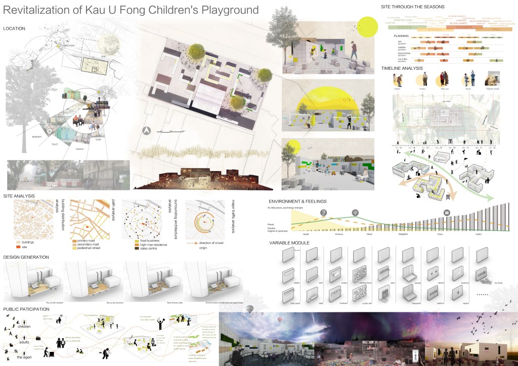 Kau U Fong Children Playground, of this competition, represents an opportunity to experiment with innovative interventions that could potentially change the aspect of this strategic area of the city. The modular concept can be applied to more urban open spaces to improve people sense of happiness and participation in life.