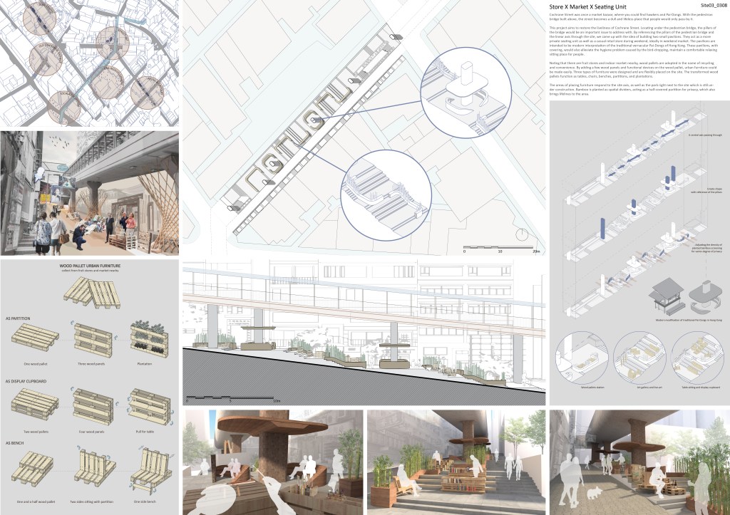 Noting that there are fruit stores and indoor market nearby, wood pallets are adopted in the name of recycling and convenience. By adding a few wood panels and functional devices on the wood pallet, urban furniture could be made easily. Three types of furniture were designed and are flexibly placed on the site. The transformed wood pallets function as tables, chairs, benches, partitions, and plantations.
