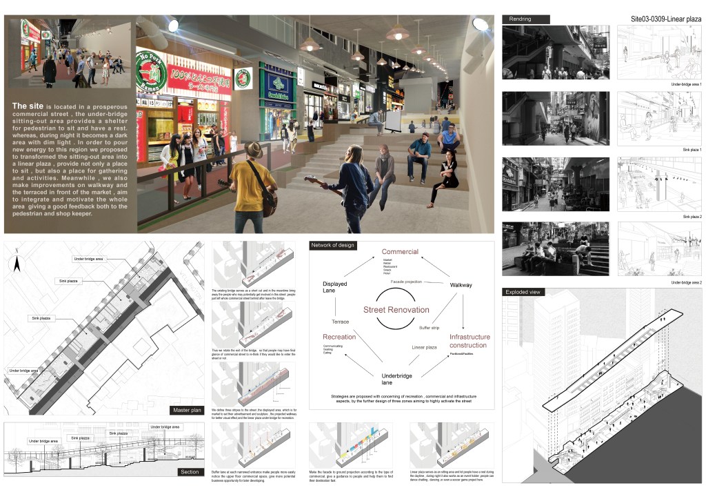 The site is located in a prosperous commercial street, the under-bridge sitting-out area provides shelter for a pedestrian to sit and have a rest. whereas, during the night it becomes a dark area with dim light. In order to pour new energy to this region, we proposed to transform the sitting-out area into a linear plaza, providing not only a place to sit but also a place for gathering and activities. The design of under-stair pavilions are able to store chairs, tables, a projector, and a temporary platform, people can play a card game, dance, or even have a soccer game projection here during the night.