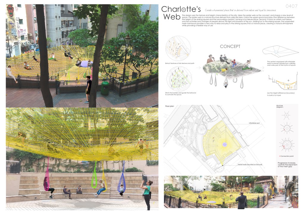 The design uses the texture and height characteristics of the site, takes the spider web as the concept, and shapes a new level of space. The spider web is a natural structure derived from daily life.Here, it blurs the upper space boundary (the difference between the height of the sinking square and the surrounding corridor), forming a fun leisure place. Second, it forms an artistic roof below, and the activities and changes of people above The light and shadow of the sun, adding fun to the sinking square, the suspended mesh hammock provides a new way to relax and play in the sinking square,This is a natural place, creating a natural atmosphere while providing a flexible way of use